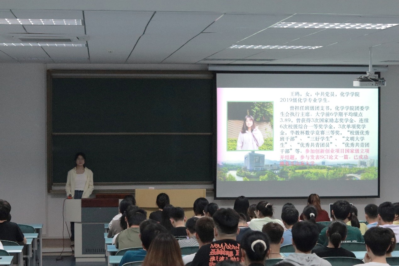 第一个进行宣讲的学姐是已成功推免至山东大学的王鸥学姐。王鸥学姐的大学生活可以用“破茧而出,绽放自我”这八个字来概括。从最初懵懵懂懂地怀着一身孤勇走出自己的“浪浪山”的小女孩,蜕变成如今全面发展的人才,王鸥学姐第一个强调的点就是脚踏实地,才能见证最后的精彩。“任何事,必作于细,也必成于实。”虽然大学知识相较于高中知识晦涩难懂,但她不曾“摆烂躺平”,而是泡在图书馆整理知识点,借助网络搜索不会的概念等。同样地,王鸥学姐告诉我们要敢于做自己,努力跳出舒适圈,可以失败但是不能放弃尝试,唯有一试,才能探得自己的极限。第三点主要是不惧困难,在挫折中前进。学姐讲述了自己做科研的故事,鼓励大家不畏艰难险阻。