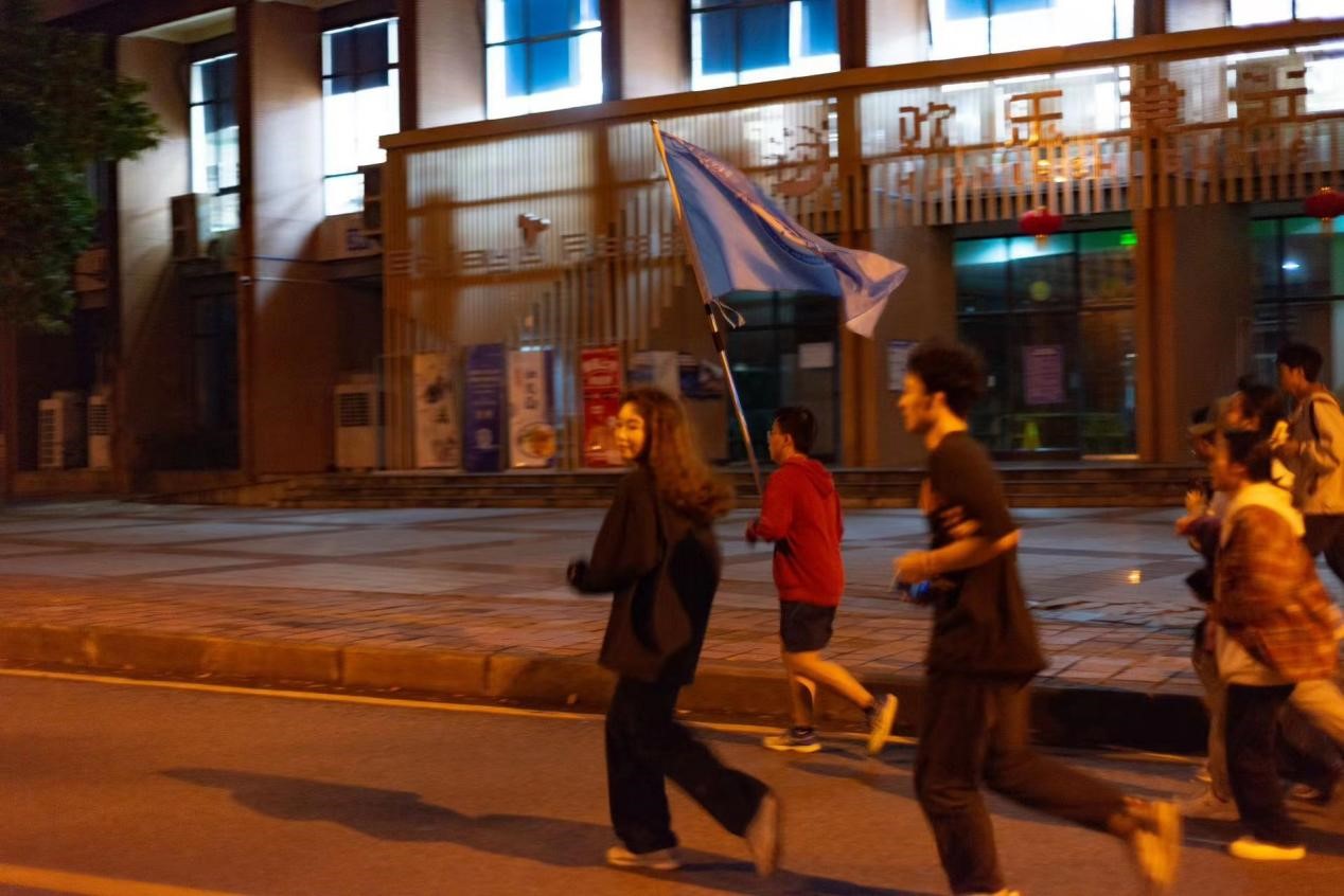 慷慨激昂的宣讲后,便是简单的热身。随后何乐尧学长手举化院夜跑旗帜带领同学们开始了今晚的夜跑。队伍浩浩大大,整齐划一。同学们随着自己的节奏一呼一吸,步伐整齐,铿锵有力。暖黄色灯光下映射的影子由浅入深;夜风中吹拂着飞扬的头发,无不展现出同学们激昂的青春活力。荧光手环在清冷的月光下熠熠生辉,仿佛象征着同学们青春的色彩。队伍从求是楼出发,沿途是熟悉的知行楼、博雅楼和第一操场,绕操场一圈后又眼看弘德楼、图书馆消失在视野中,最终返回求是楼签到打卡。同学们迈着整齐的步伐,在带领下有序完成了夜跑。尽管已经累得满头大汗,气喘吁吁,但是没有一人选择退出,正是这种拼搏不放弃的精神激励着同学们坚持到了最后。