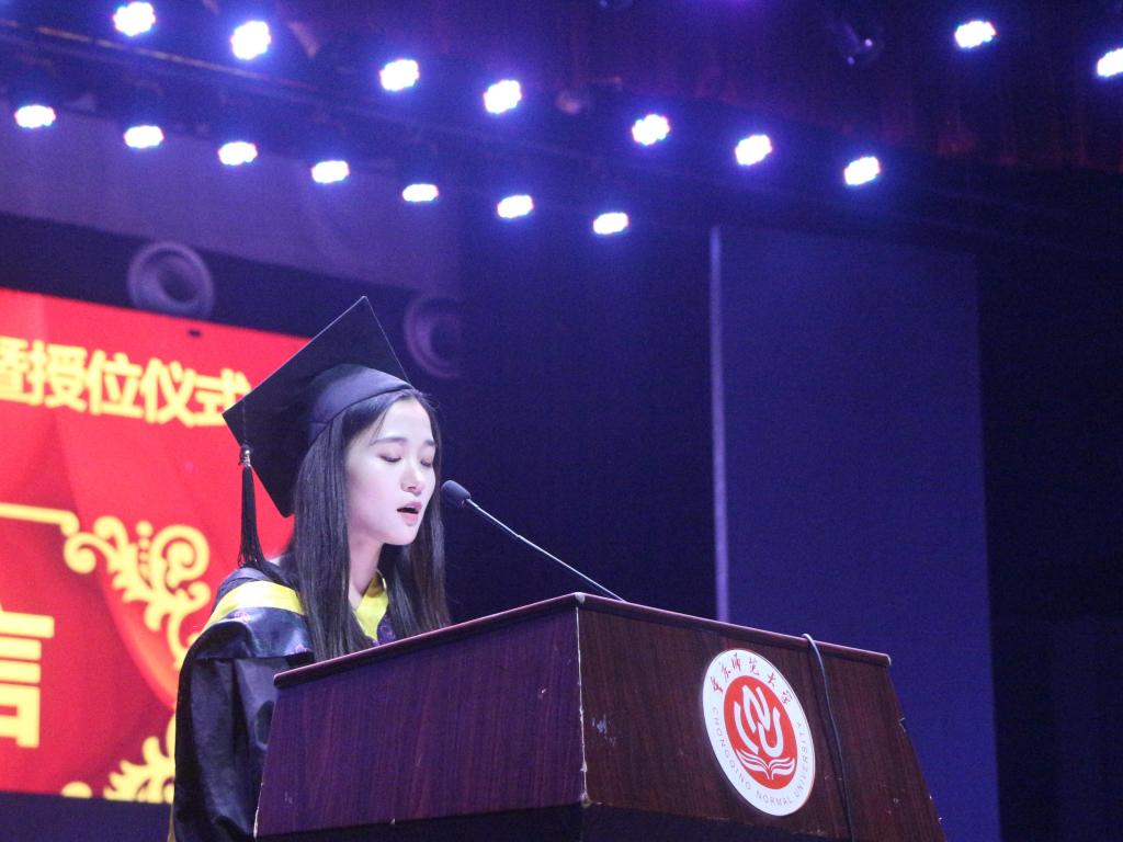 领导于主席台前就坐。庄严肃穆的国歌声响起,在场的老师和同学全体起立,奏唱国歌。接着,研究生代表闵远洪同学上台发言,“落红不是无情物,化作春泥更护花”,老师的指导和帮助,父母的关心和爱护,同学的团结与互助,让化院学子带着梦想,再次出发。本科生代表谭鑫同学说:“毕业不是代表结束,而是欢呼的开始,不是庆祝完成,而是宣告继续向前。”徐玉萍提到,无论鱼翔浅底,还是鹰击长空,我们都要自强不息,不断进步。