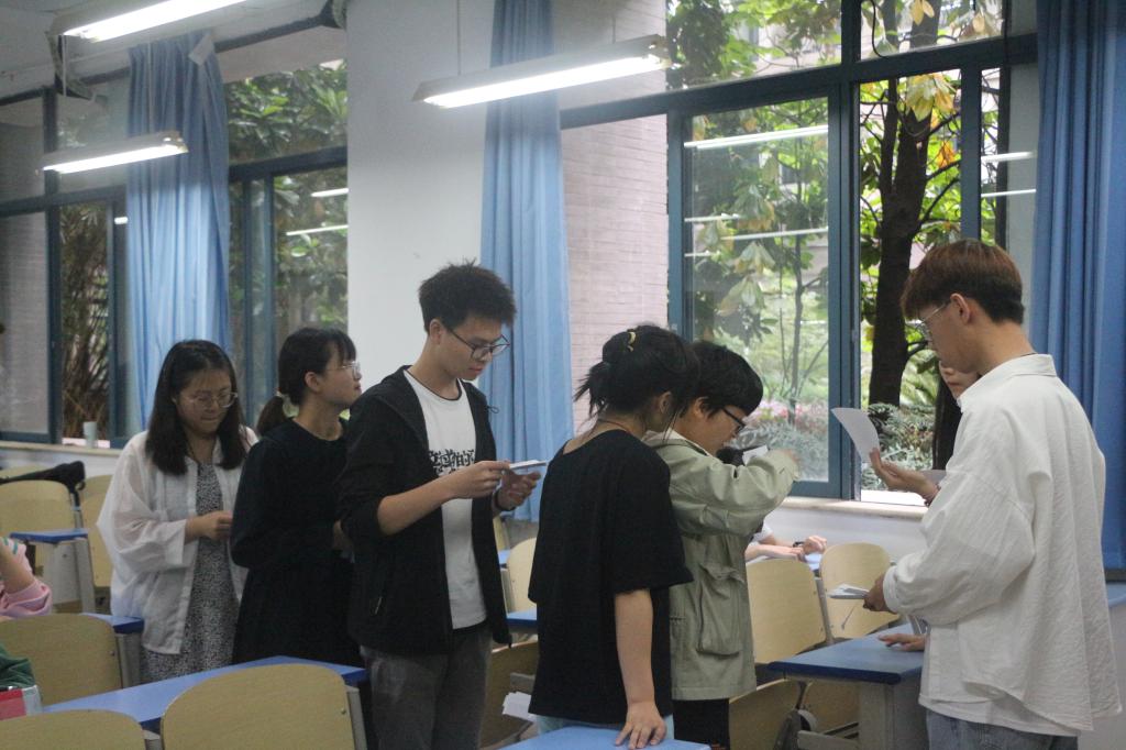 2021年5月25日,参赛选手进行了首轮比拼`。活动伊始,主持人宣布比赛规则:PPT展示题以目,参赛选手进行限时答题。教室里寂然无声,各参赛者都聚精会神的盯着PPT上的题目,仔细思索后于答题纸上写下答案。10分钟后,主持人宣布比赛结束,同学们怀着期待又紧张心情陆续离开教室……