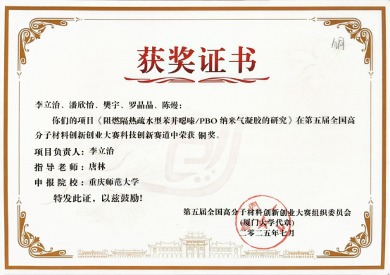李立治、潘欣怡、樊宇、罗晶晶和陈熳等同学的参赛作品《阻燃隔热疏水型苯并噁嗪/PBO纳米气凝胶》获得科技创新赛道全国铜奖,进一步展示了猫都论坛