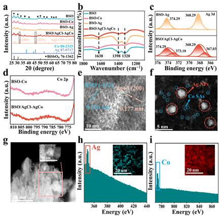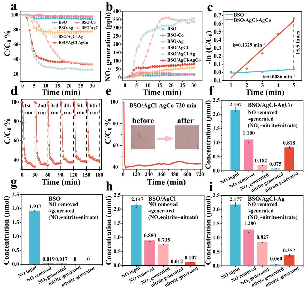 研究团队通过精准的催化剂结构设计,构建了BiSbO₄/AgCl-AgCo多组分光催化体系。该体系具有多重结构优势:其一,BiSbO₄与AgCl形成的异质结可构建内建电场,有效促进光生电荷的定向分离与传输;其二,引入的银纳米颗粒(Ag NPs)可通过表面等离子体共振效应,显著增强催化剂对可见光吸收的吸收能力;其三,原子级分散的钴单原子(Co SAs)作为高效活化中心,能够精准调控催化反应路径。实验结果表明,该催化剂在可见光照射下, NO去除效率可达67.0%,且NO₂生成量被抑制在80 ppb,远优于未修饰的BiSbO4/AgCl(335 ppb)和BiSbO₄/AgCl-Ag(329 ppb)催化剂。此外,稳定性测试显示,该催化剂连续运行720分钟后仍保持57%的催化活性,并在经过六次循环后,效率仅下降6.4%,展示出优异的长期稳定性与循环使用性能。