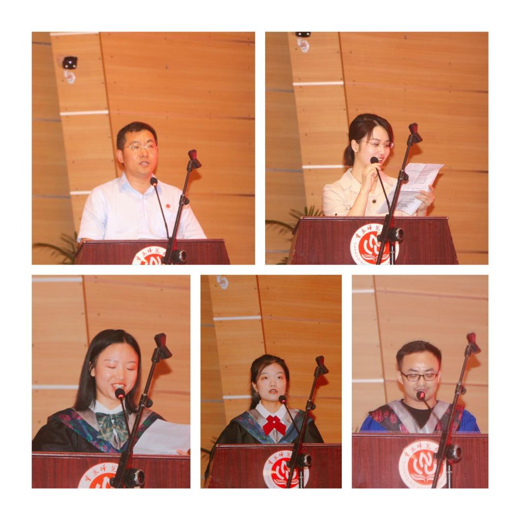 党政领导班子全体成员、学院学位评定委员会委员、各系主任、教师代表、各科室负责人以及全体辅导员出席了本次活动。毕业典礼氛围两个部分,分别由毕业生代表李娜、院党委副书记蒋红主持。