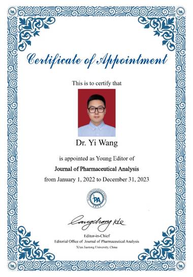 王燚教授当选Journalof Pharmaceutical Analysis (JPA)学术期刊青年编委