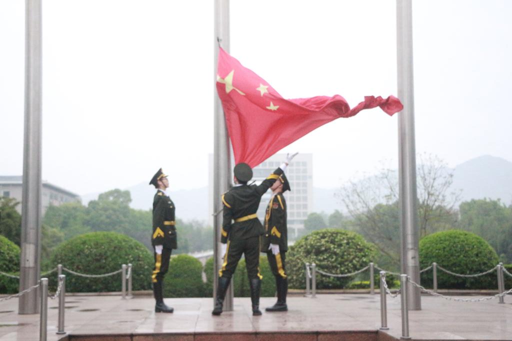 在主持人下达“出旗”口令后,音乐响起,全体肃静,国旗护卫队队员们目光坚定、昂首挺胸、踏着稳健的步伐,护卫着国旗走到升旗台。迎着第一缕晨曦,伴着《义勇军进行曲》的旋律,鲜艳的五星红旗在全体师生的庄严注目下冉冉升起,迎风飘扬。