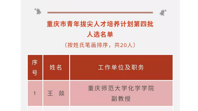 根据《关于印发重庆市高层次人才特殊支持计划5个子计划实施办法的通知》(渝委组[2013]28号)和《关于做好重庆市青年拔尖人才培养计划第四批人选申报工作的通知》(渝委组[2018]16号)规定,经评审,猫都论坛 王燚老师入选重庆市青年拔尖人才培养计划第四批人选。