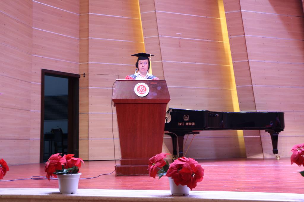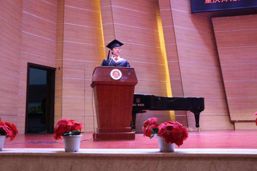 毕业生代表曾杨与代文强发言。亲情、友情、爱情、师生情,四年的点点滴滴,四年的成长收获,告别过去,以不屈精神,怀豪情壮志,追逐自己的梦想。曾杨与代文强还表达了对学院、老师、家人朋友的感谢,并真诚地祝毕业生们毕业快乐。