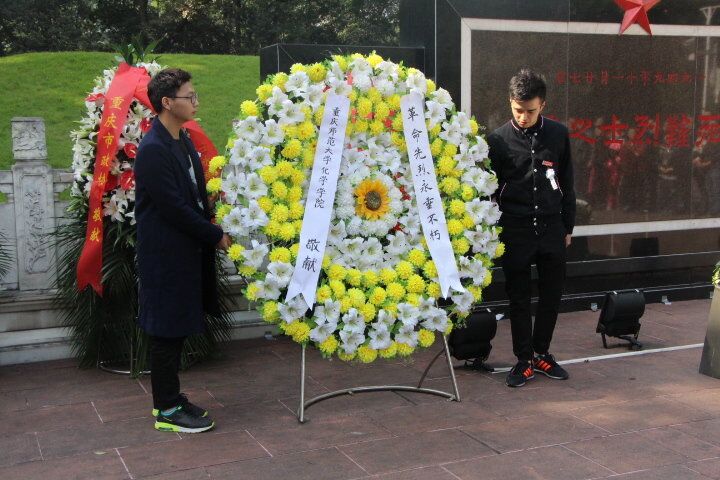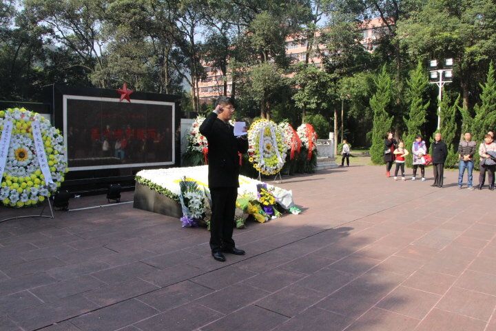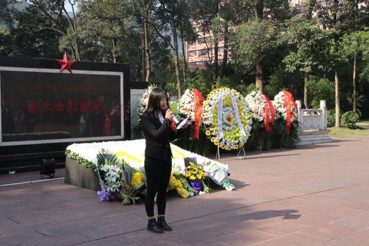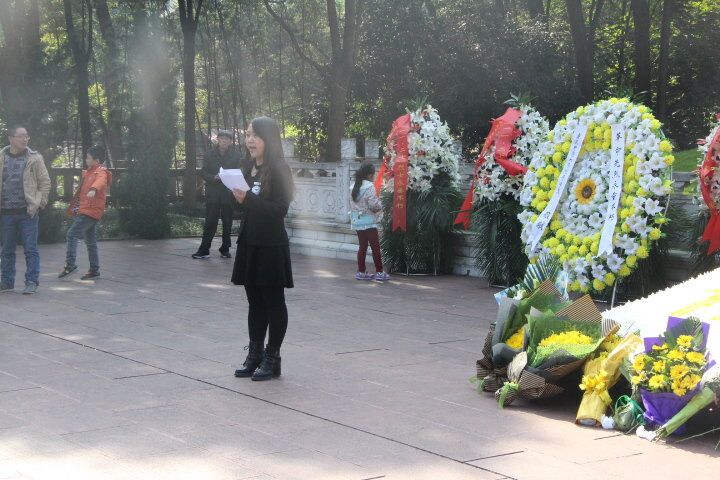 宣誓墙出发乘坐轻轨前往重庆烈士墓。在阳光的照耀下,烈士墓前的石碑旗帜显得格外耀眼。六十七年前的11月27日,“他们”因信仰而奉献自己;六十年后的今天,我们因他们而站在这里。大家集合完毕后,一起走进神圣庄严的地方——烈士墓。首先,由组织部部长陈开春学姐主持宣布活动正式开始。在支持人简述白公馆大屠杀之后,大家正对烈士墓三鞠躬,紧而来之,大家默哀一分钟将庄重的气氛推至顶峰。随后,马列部部长王俊波和梦想公益协会会长王平代表学生献花,党员王苗慧代表讲话,学生代表陈昱州带领宣誓,全体人员献花,向先烈们传达我们的敬仰情怀,不忘初心,铭记历史。最后,全体人员在纪念碑前留影怀念,并参观博物馆,感受先烈们的革命情怀。