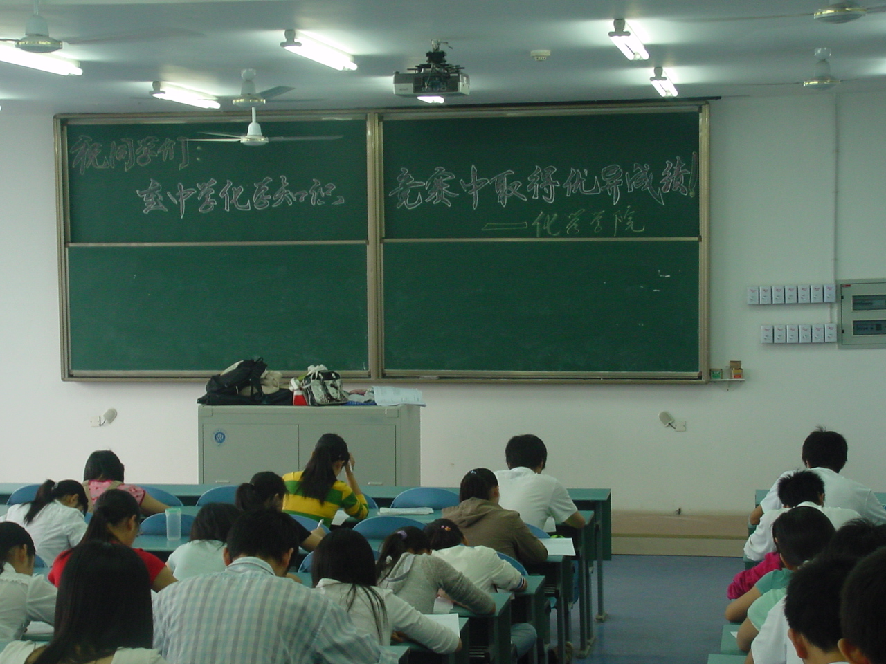 2008年5月31日上午8:30,猫都论坛 “中学化学知识竞赛”在老校区和大学城校区同时举行,05级、06级和07级化学(师范)专业的全体同学参加了本次竞赛;竞赛现场中,同学们态度端正,积极思考,认真答好每一道题;竞赛取得圆满成功。今后,猫都论坛 将坚持举办类似的竞赛,以提高同学们的专业技能,为同学们“大四”实习和日后走上工作岗位打下坚实的基础。