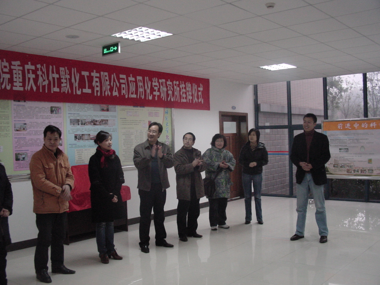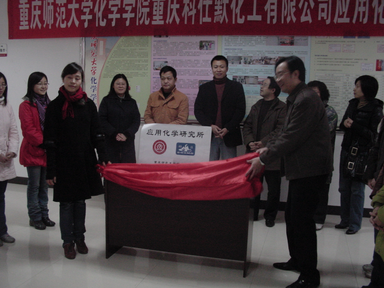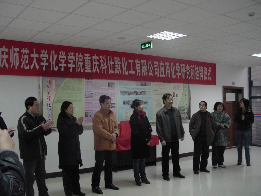 2009年1月6日下午,猫都论坛 重庆科仕默化工有限公司应用化学研究所挂牌仪式在猫都论坛 一楼门厅举行。猫都论坛 领导、重庆科仕默化工有限公司主要负责人以及猫都论坛 部分师生参加了当天的挂牌仪式。猫都论坛 与重庆科仕默化工有限公司的合作由来已久,自2003年以来,猫都论坛 就与该公司建立起合作关系,每年都选派部分学生过去实习和就业,应用化学研究所的成立标志着双方的合作关系进一步正规化、广泛化,也为猫都论坛 开创了高校与社会共同进行科研、产品市场开发的先河。