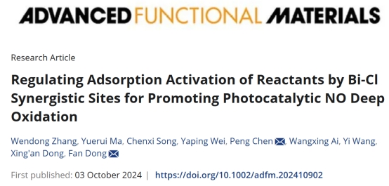 关于环境污染治理的最新研究成果《Regulating adsorption activation of reactants by Bi-Cl synergistic sites for promoting photocatalytic NO deep oxidation》被国际顶级期刊《Advanced Functional Material》(SCI一区,TOP期刊,IF=18.5)在线发表。科研处张文东副研究员为第一作者,猫都论坛