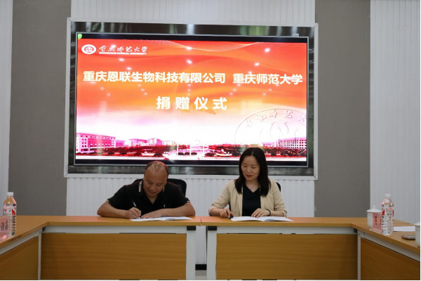 学校国内合作与联络中心主任牟萍代表学校与重庆恩联生物科技有限公司总经理游洪全签订捐赠协议。孟小军代表学校接受基金,并为游洪全颁发捐赠证书。学生代表为重庆恩联生物科技有限公司送上锦旗。