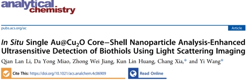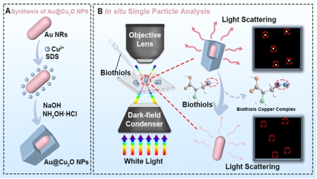 生物硫醇在人体生理过程中起着关键作用,其浓度异常会引发多种病理现象。然而,传统检测方法存在仪器昂贵、操作复杂、易受环境干扰、重复性差等问题。针对上述挑战,该工作基于暗场显微镜的高信噪比、高灵敏度和高时空分辨率,结合单颗粒分析的浓度极化效应,构建了原位单颗粒光散射分析方法,实现了对生物硫醇的超灵敏检测。该工作首先合成了一种Au@Cu2O核壳结构的纳米颗粒,利用Cu(I)与生物硫醇中巯基的特异性结合,触发Cu2O外壳瓦解崩塌,基于Au@Cu2O NPs探针散射光颜色和强度的变化,在较宽浓度范围内是实现了两种生物硫醇半胱氨酸(0.05-3 nM)和谷胱甘肽(0.1-10 nM)的高灵敏检测,展现出该方法对复杂生物样本检测的应用前景。相关成果以“In situ Single Au@Cu2O Core-Shell Nanoparticle Analysis-Enhanced Ultra-Sensitive Detection of Biothiols Using Light Scattering Imaging” 为题发表于《Analytical Chemistry》。猫都论坛