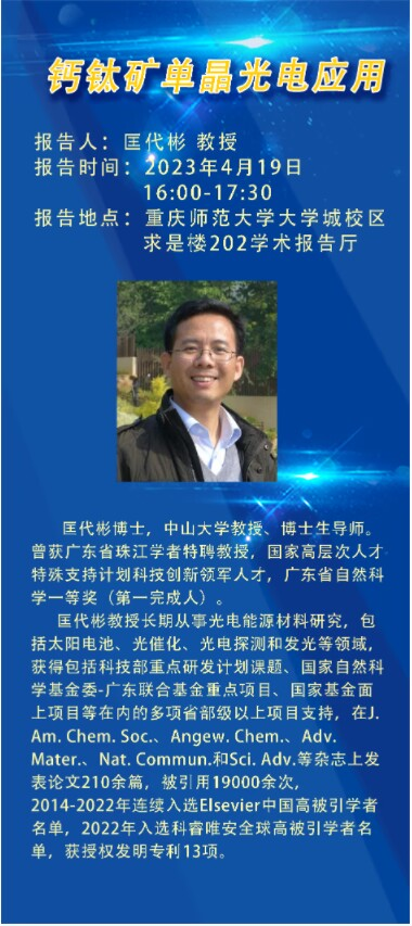学术报告预告:匡代彬(中山大学)——钙钛矿单晶光电应用
