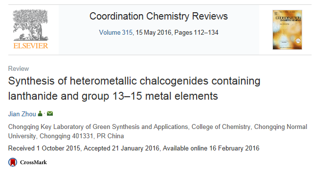 周健教授课题组在“稀土硫属化合物晶态材料的低温溶剂热合成、结构和性能”领域,开展了一系列深入、系统的研究工作,获得了一系列重要研究成果,并受到了国内外同行的极大关注。该研究小组受邀在化学领域国际权威期刊《Coordination Chemistry Reviews》上发表题为‘Synthesis of heterometallic chalcogenides containing lanthanide and group 13–15 metal elements(Coordination Chemistry Reviews 2016,315,112–134)’的研究综述文章。《Coordination Chemistry Reviews》(TOP 5%)是化学领域SCI一区刊物,SCI五年影响因子13.174。该期刊主要向国际上有一定影响力的科学研究者约稿,标志着猫都论坛